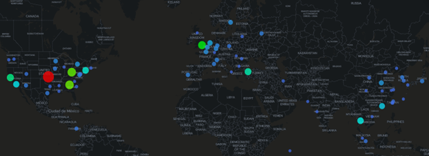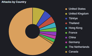 Below in Figure 2, we can see the attack map for locations where these attacks on the Conpot were occurring. Surprisingly, many of these attacks occurred from inside the United States. However, there was still a significant number of attacks that occurred from the Eastern and Northern Hemispheres. Figure 3 shows a pie chart of the number of attacks by each country. This further showcases the surprising fact that >60% were happening from inside the United States. An important thing to note, however, is that due to technology like VPN, proxies, etc, these statistics are likely slightly skewed than the actual locations of where these attacks might be occurring.