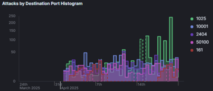 Figure 4 allows us to draw even more conclusions about these attackers. This figure outlines the top 5 destination ports that were attacked on the Conpot as well as the day these attacks occurred over time. Table 2 was broken out from this histogram to further elaborate on what these results mean. To summarize the table, most of these ports are typical for ICS. This makes sense in the context of the project since we are replicating an ICS with our Conpot. Ports 1025 and 50100 are typically dynamic ports, but not necessarily ICS-specific. However, port 10001 is used commonly in air control, and port 2404 is used commonly in the electric power industry, which are both very ICS specific. Lastly, port 161 is used for SNMP, which is not ICS specific but useful for gathering data about a system or device, so it makes sense why attackers would aim for it.
