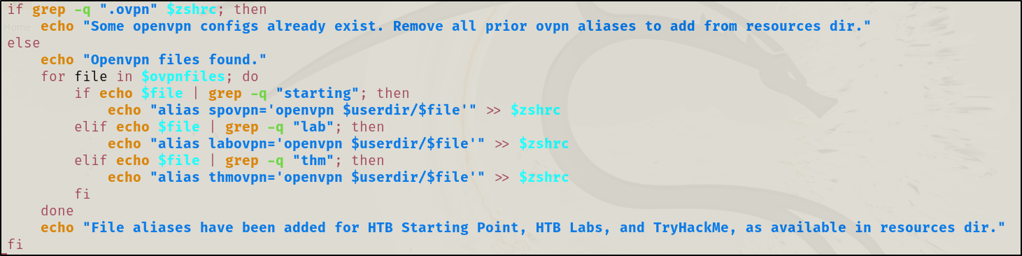 My next step was actually finding the .ovpn files. After some consideration, I decided the best implementation was adding a resources directory in the current working directory with the appropriate .ovpn files. This would allow others to use the script with their own files provided they added the new directory. While I initially counted the underscores in each file name (2 for HackTheBox Starting Point, 1 for HackTheBox Labs, and 0 for TryHackMe), I found this to be unreliable at best. Instead, I decided to prepend the filenames with specific strings (e.g. "lab" for HTB Lab files) to identify them, making it easy to expand this section later. For each file name found in the resources directory, I added an associated alias line to the .zshrc using echo and output redirection (>>).